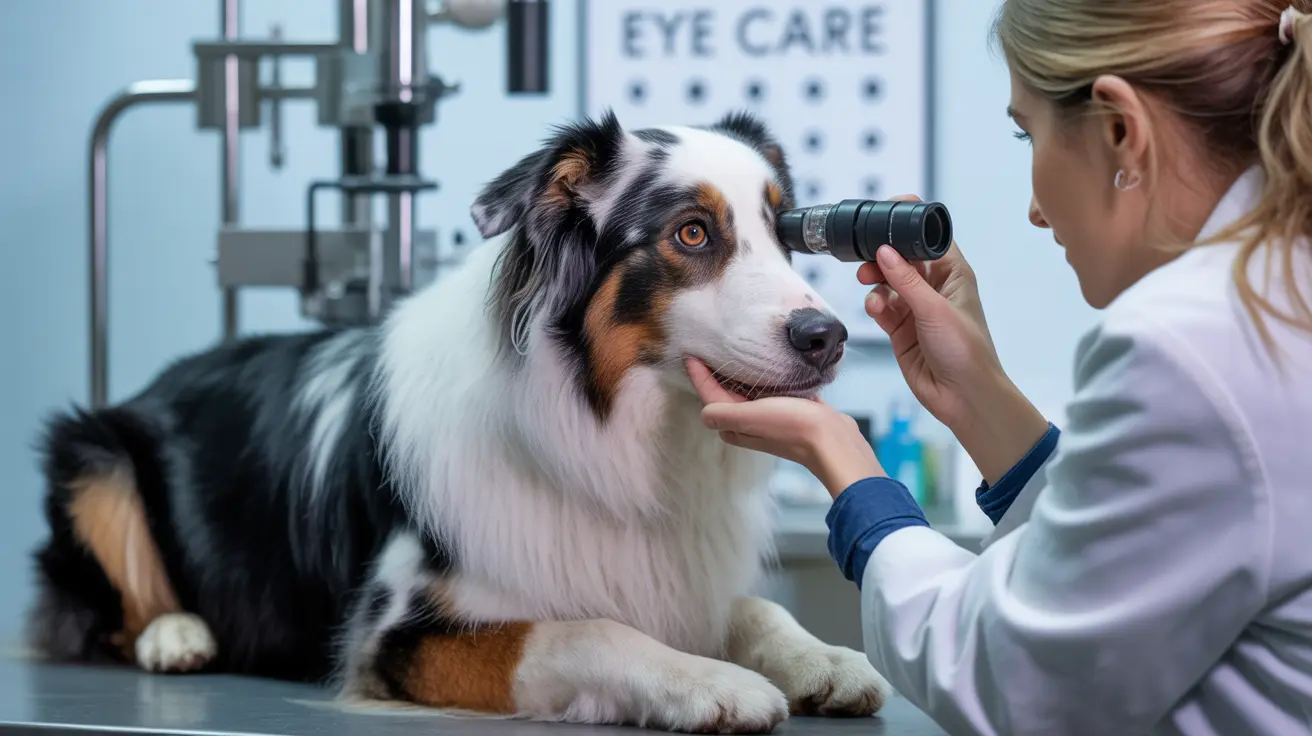 A veterinary professional performing an eye examination on an Australian Shepherd dog in a clinical setting