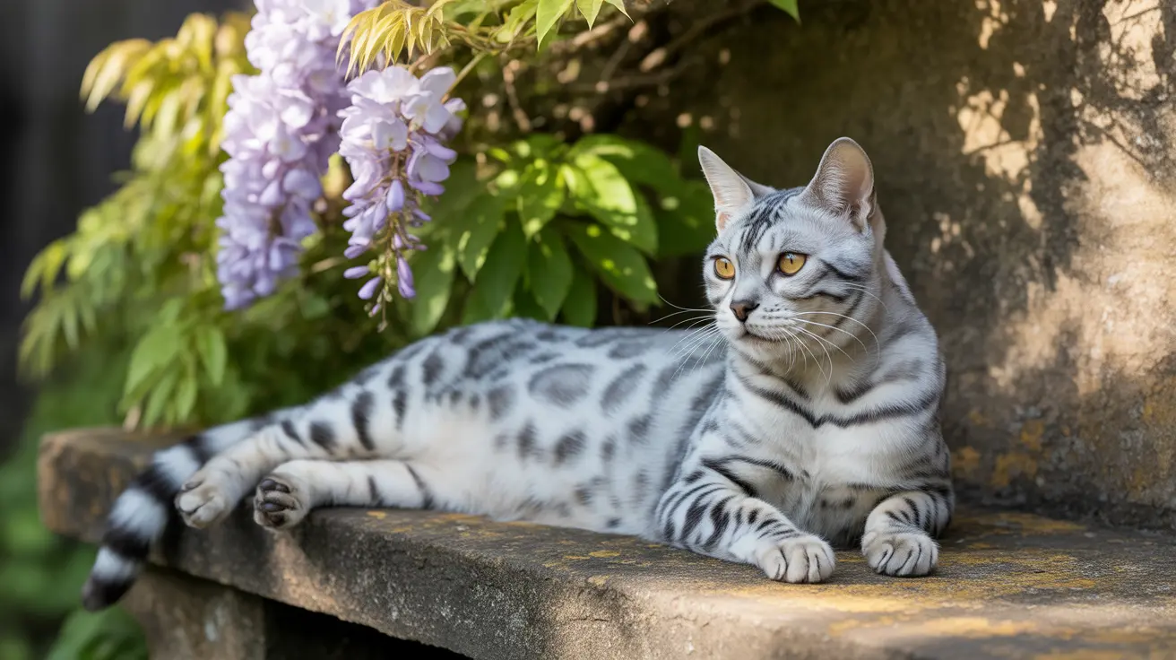 A silver and white Bengal cat lounging gracefully on a stone surface near blooming wisteria flowers