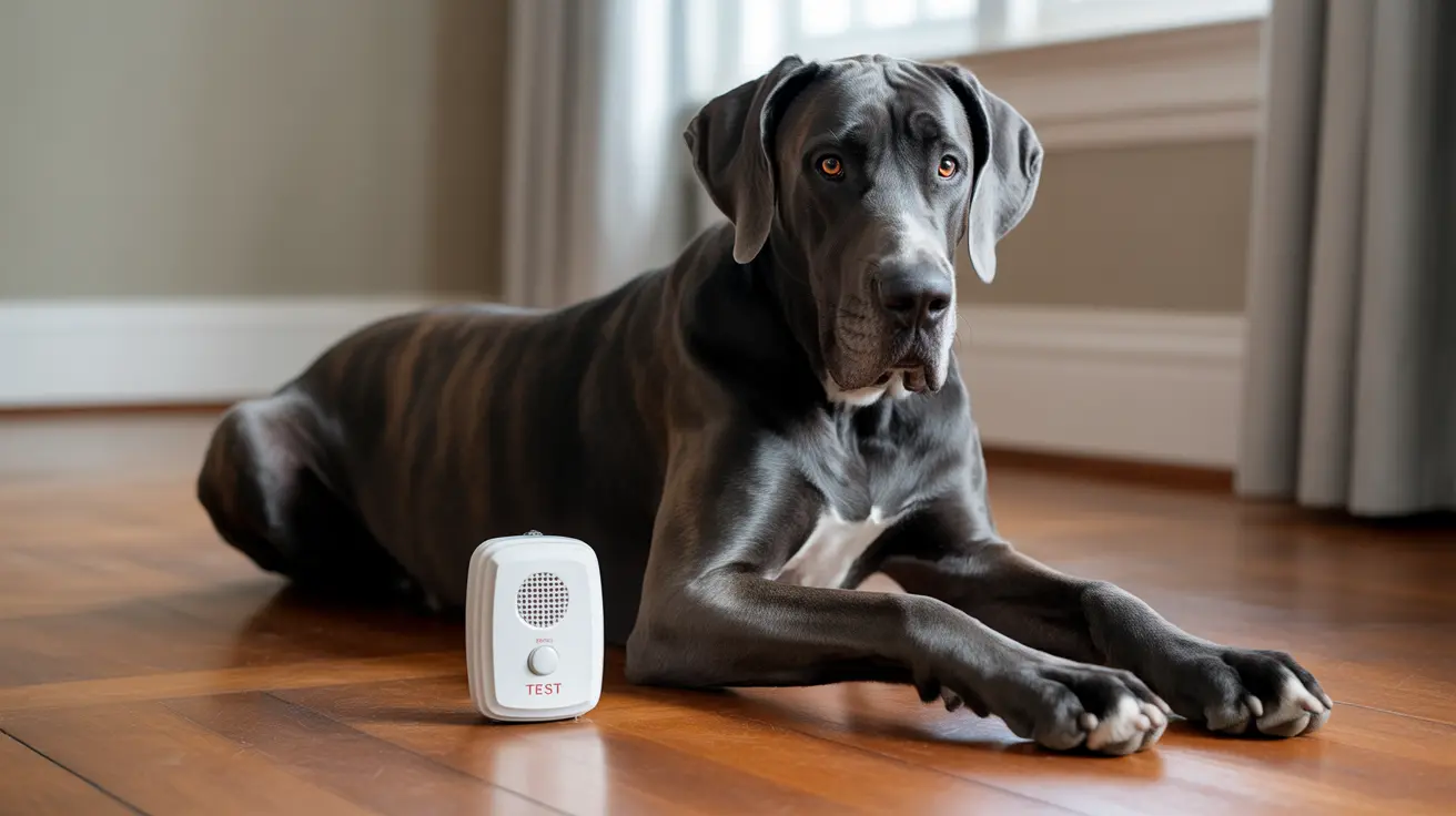 A large gray Great Dane sitting calmly on a wooden floor next to a small white electronic device