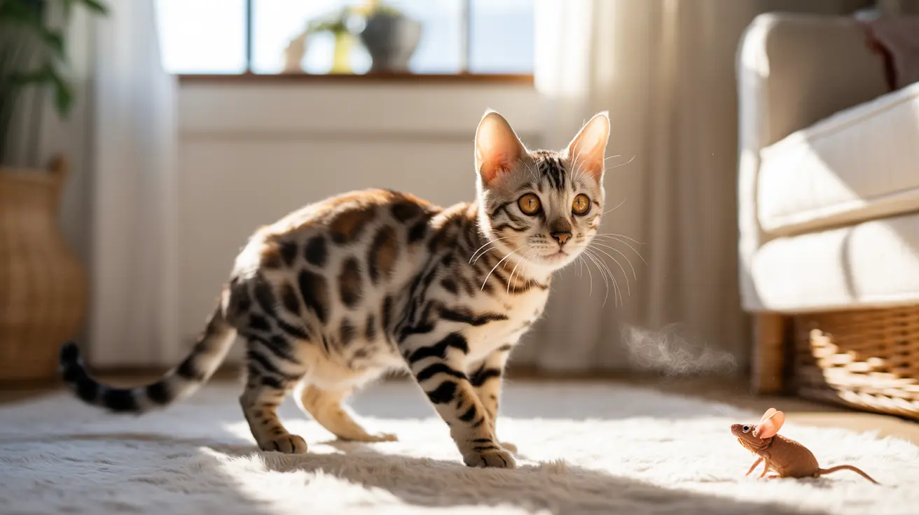 A Bengal cat with distinctive spotted coat standing on a carpet near a toy mouse, with sunlight streaming through a window.