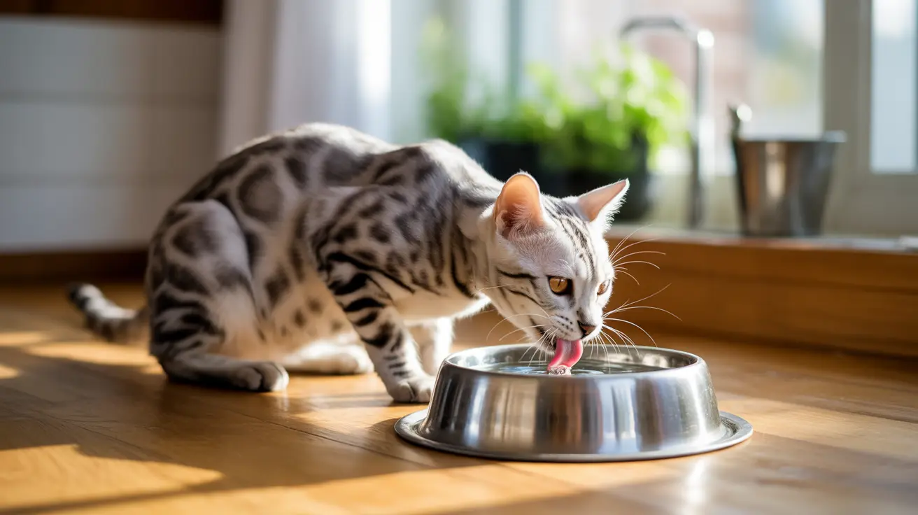 A silver and black spotted Bengal cat drinking water from a metal bowl near a bright window