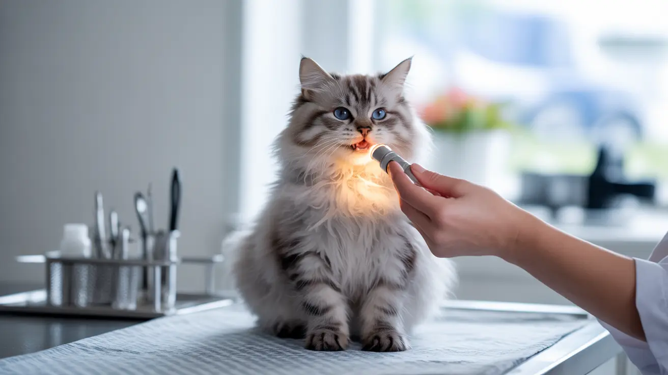 Look for signs such as excessive drooling, difficulty eating, pawing at the mouth, bad breath, and visible red or white patches in the mouth. Cats may also show behavioral changes like increased irritability or withdrawal.