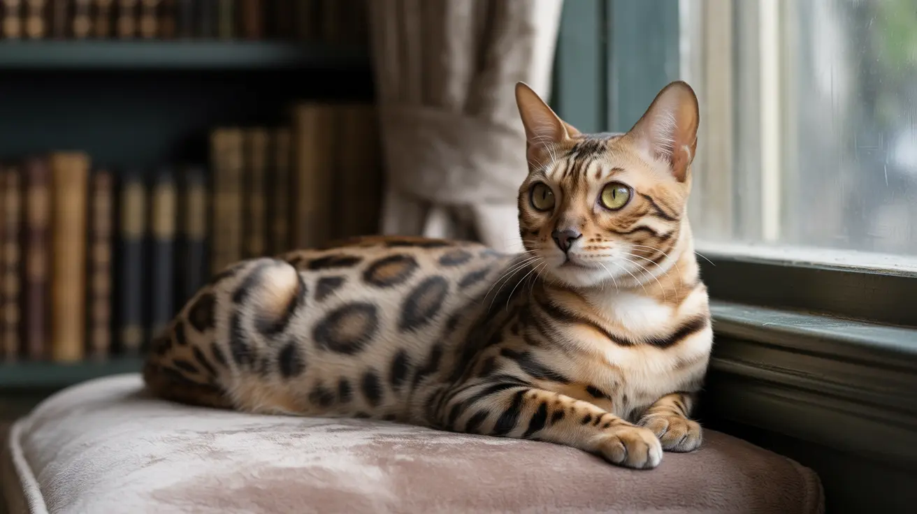 A Bengal cat resting elegantly by a window with bookshelves in the background