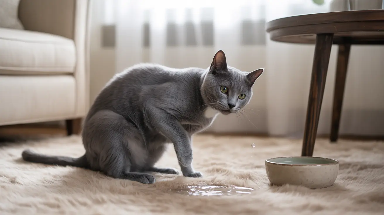 Gray Russian Blue cat sitting on a beige rug near a spilled liquid by a ceramic bowl