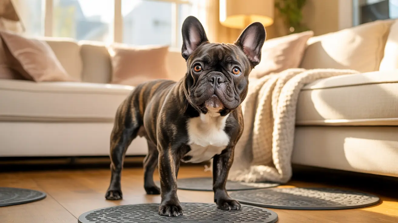 A French Bulldog standing attentively on a round textured mat in a cozy living room setting.
