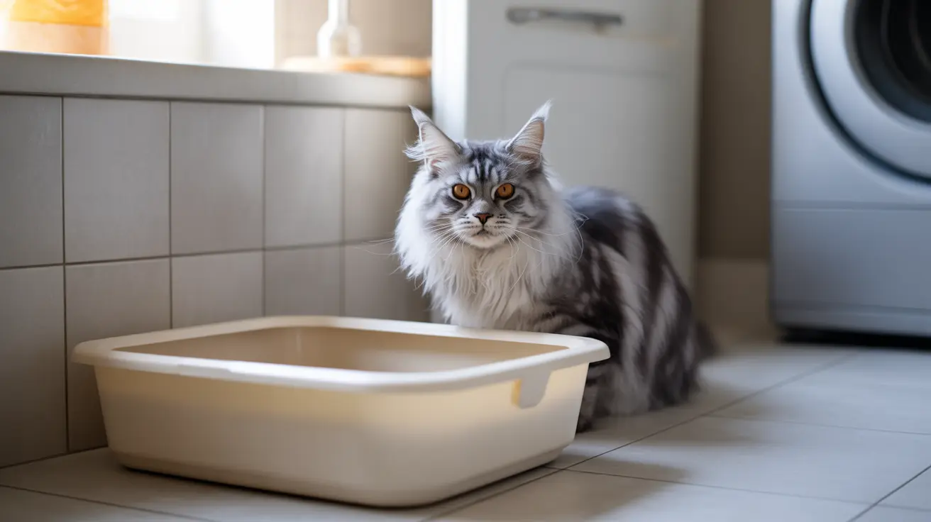 A majestic Maine Coon cat sitting next to a clean litter box in a tiled bathroom or utility room.