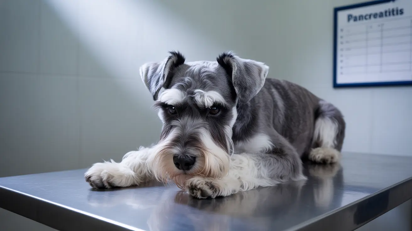 Un perro Schnauzer descansando en una mesa de examen veterinario con un cartel de 'Pancreatitis' en el fondo.