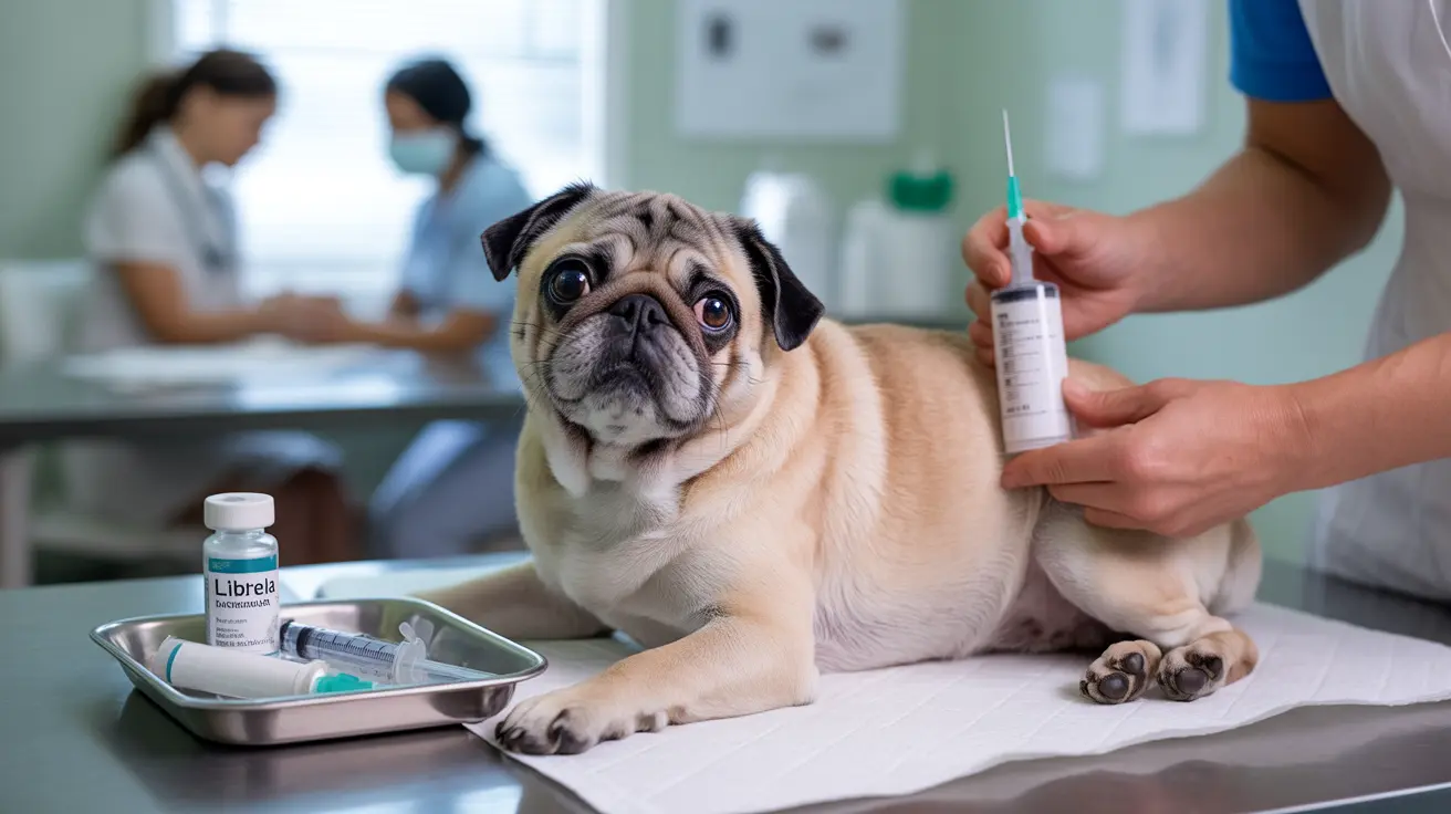 A fawn-colored pug on an examination table at a veterinary clinic, about to receive an injection