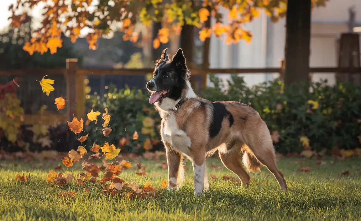 A Belgian Tervuren stands proudly in a garden, its fur shining in the sunlight as it herds autumn leaves.