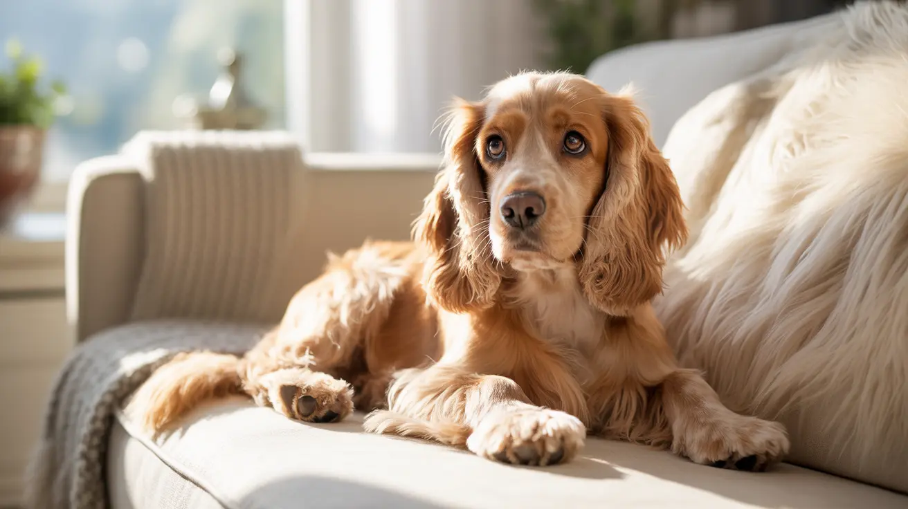 - Shaggy, mixed-length coat in warm golden-tan tones
