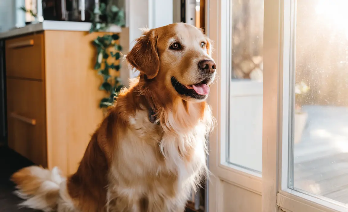 A Golden Retriever sits patiently by the kitchen door, eyes wide and tail wagging in the afternoon sun.