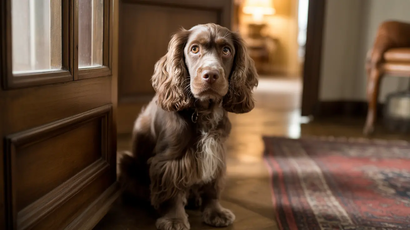 A brown Cocker Spaniel quivering by the living room door, attentive to thunder