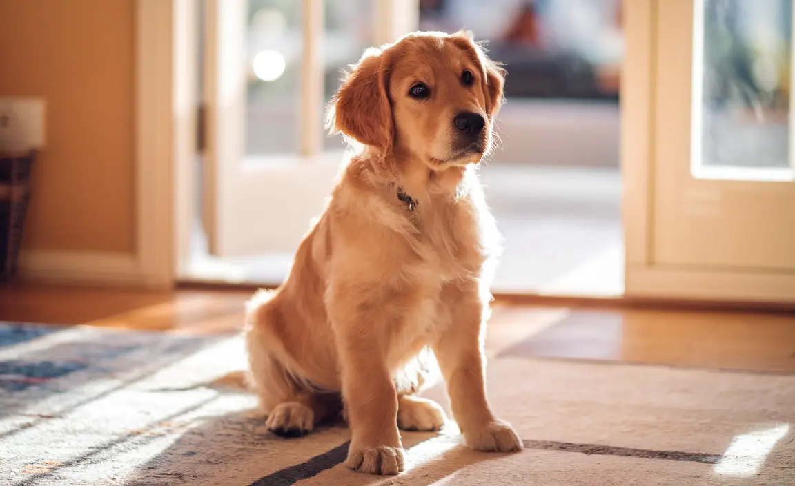 A Golden Retriever puppy sits attentively on the living room rug, its head slightly tilted as it gazes up with curiosity.