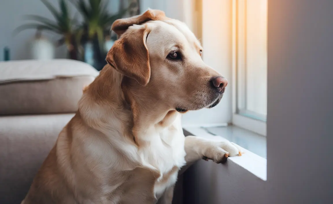 Worried Labrador Retriever gently scratching behind its ear by the window, morning light highlighting its glossy coat.