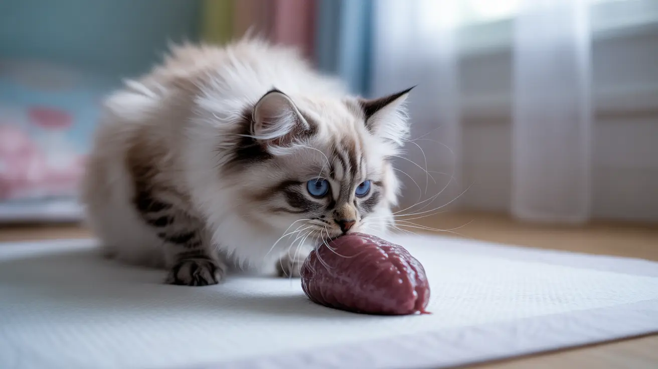 Mavi gözlü kabarık bir Ragdoll kedi, beyaz bir yüzeyde çiğ et parçasını inceliyor.