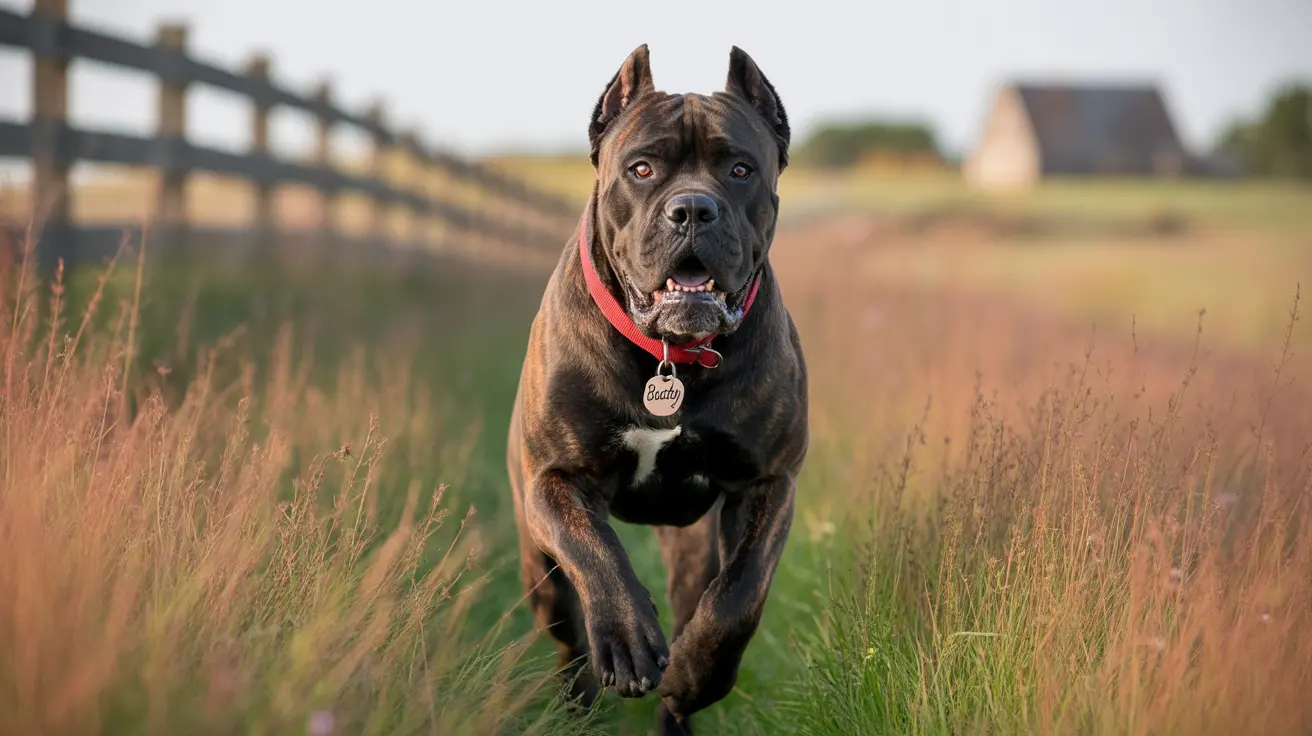 A powerful Cane Corso running through a grassy field with a wooden fence and farm buildings