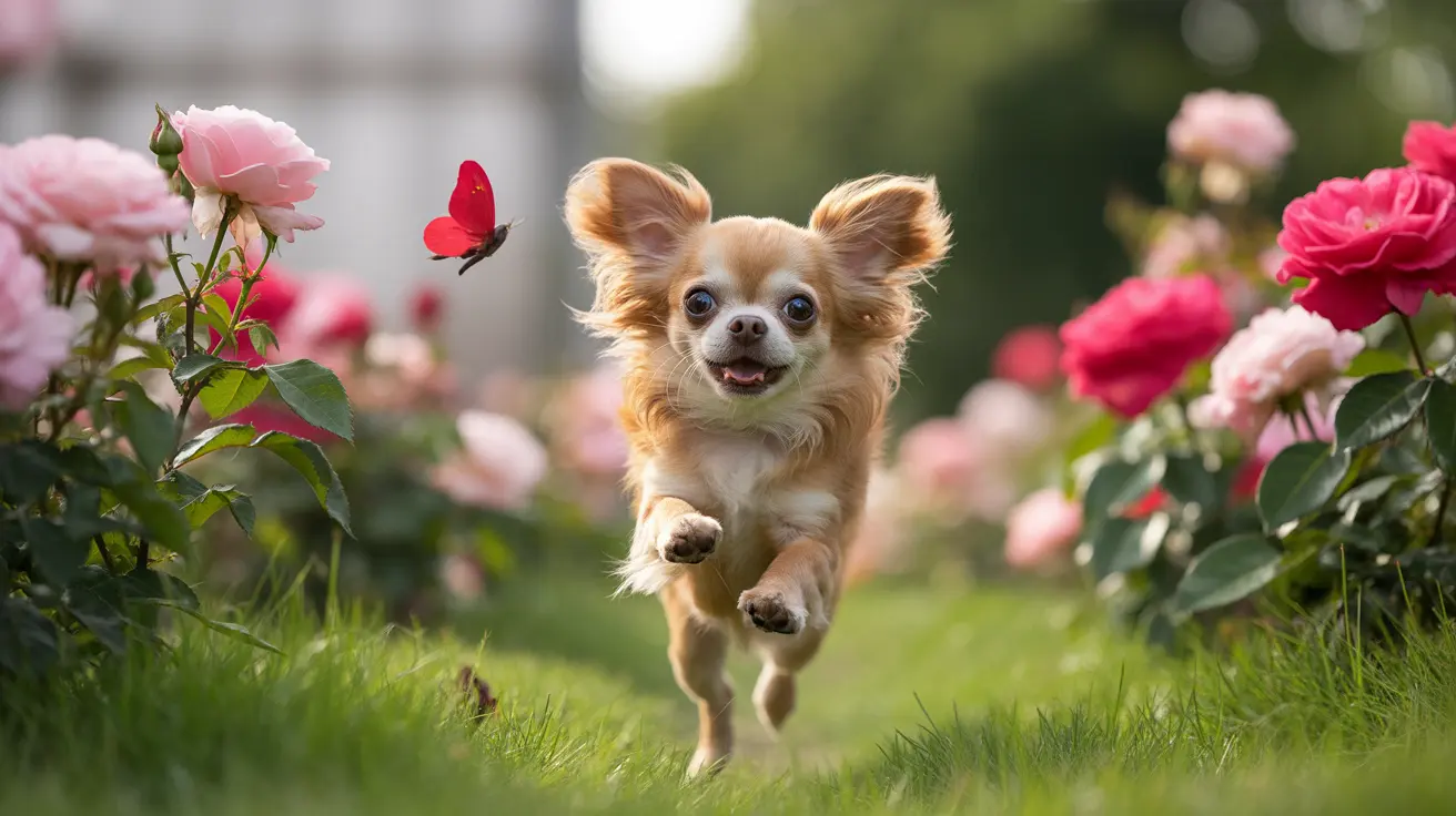 A joyful long-haired Chihuahua running through a rose garden with a red butterfly nearby