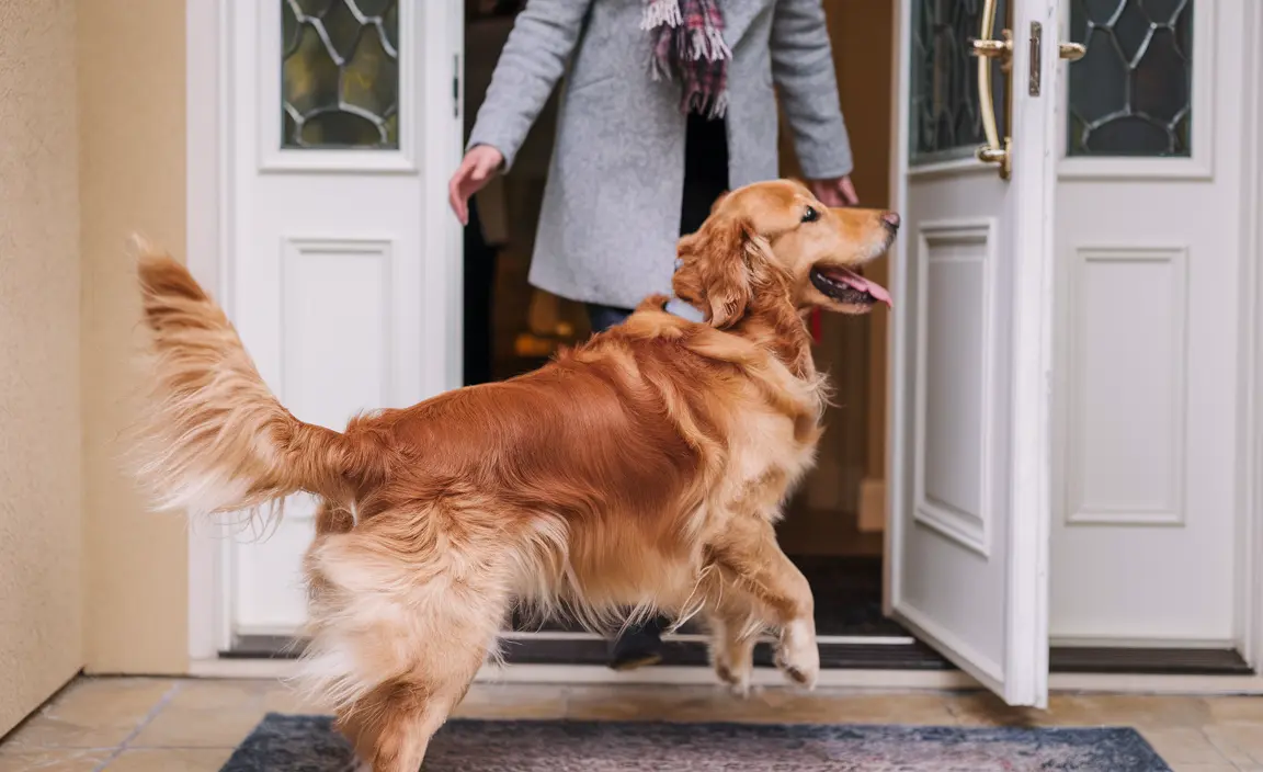 A Golden Retriever eagerly jumps up with a wagging tail as its owner enters the front door, eyes shining with joy.