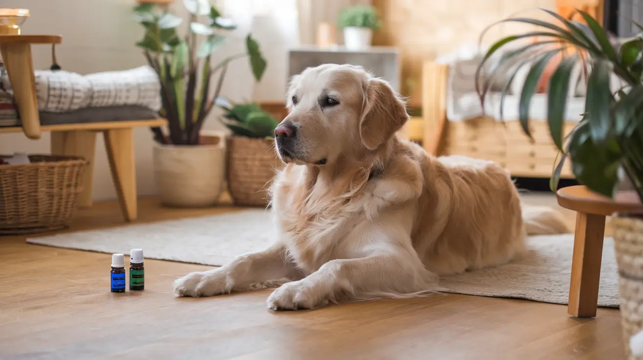 A dog in a safe, serene indoor setting with essential oils and plants in the background, emphasizing safety and holistic care.