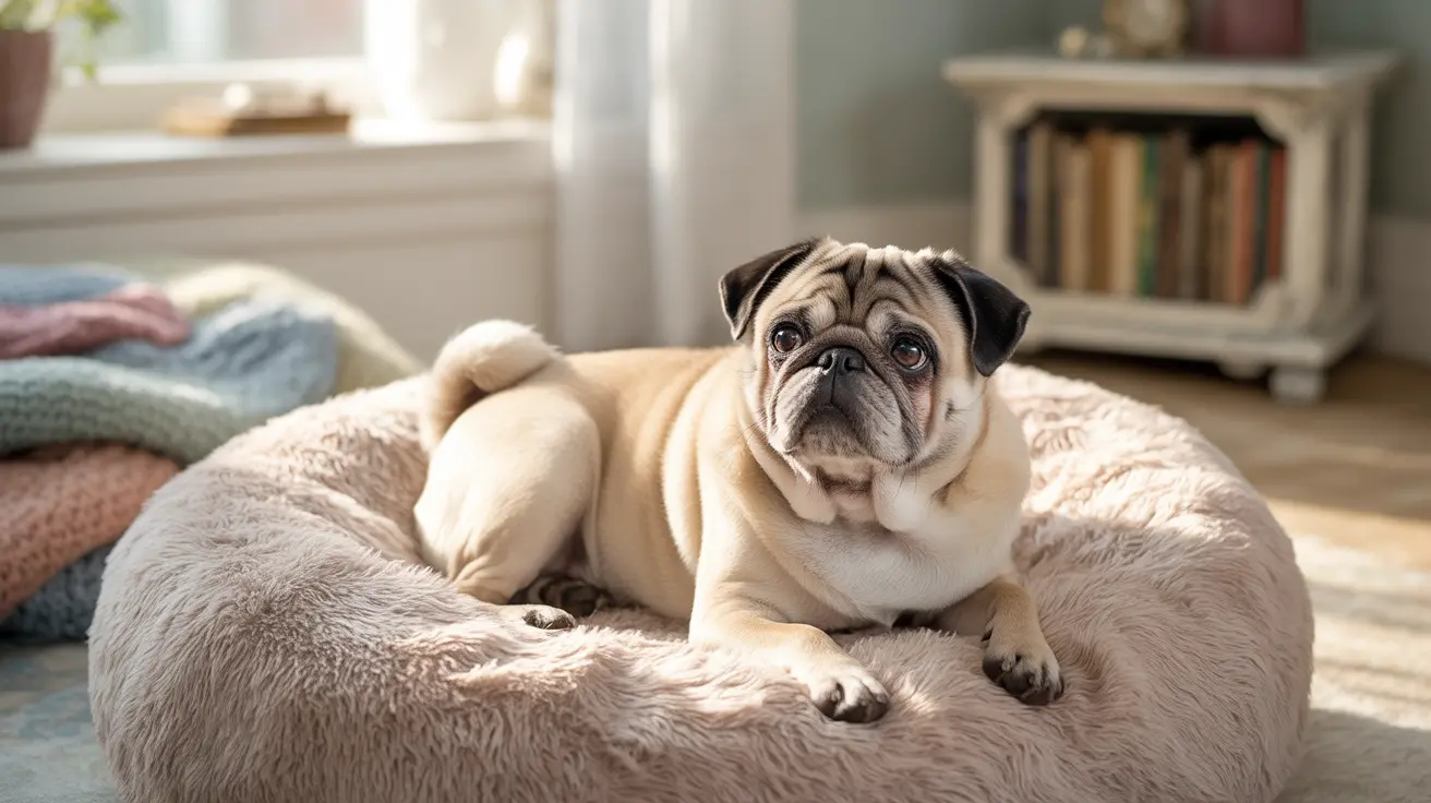 Um Pug de cor fawn descansando confortavelmente em uma cama de cachorro macia e bege em um ambiente interno aconchegante.