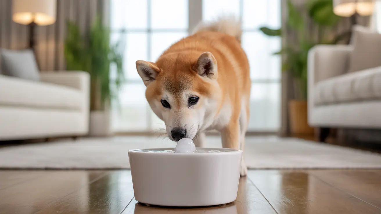 Um Shiba Inu dourado bebendo água de uma tigela de cerâmica branca em uma sala de estar moderna e iluminada.